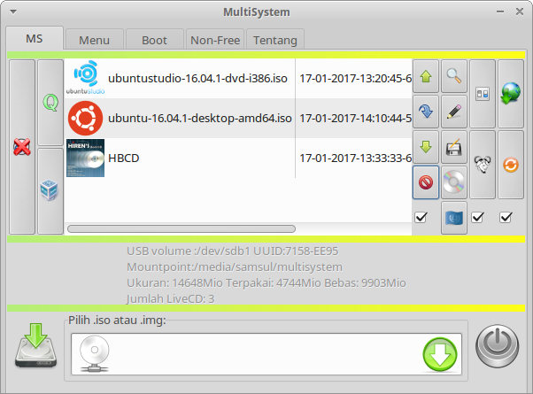 - Oiya, pastikan flashdisk yang akan digunakan untuk membuat installer telah tertancap di laptop/komputer kita dan telah dimout di sub directory /media. Setelah muncul aplikasi multisystemnya, seperti di bawah ini :
